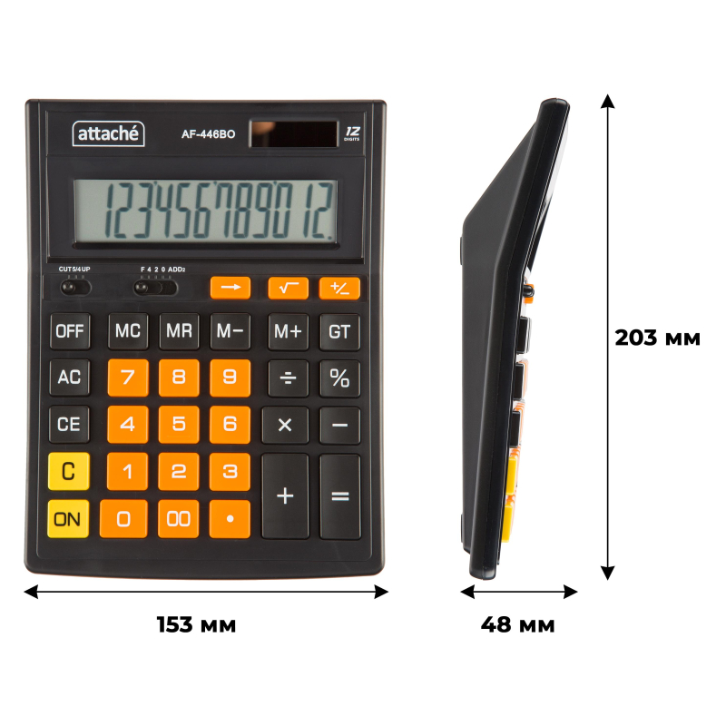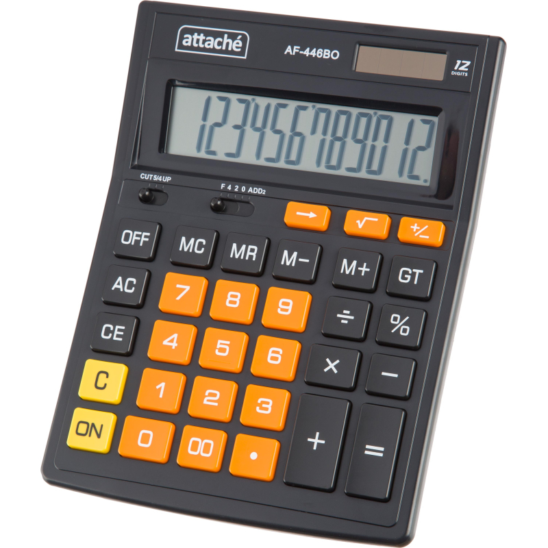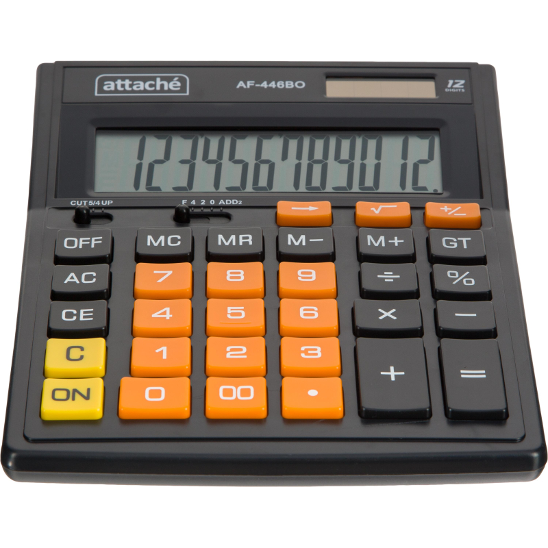 Калькулятор Attache полноразмерный настольный AF-446BО настольный с 12-разрядным ЖК-дисплеем. Эргономичная форма панели и крупные клавиши создают максимальный комфорт в использовании. Корпус изготовлен в черном цвете с кнопками оранжевого цвета. Оптимальный и необходимый набор функций, среди которых: независимая память, MC, MR, M+, M-, GT, расчет процентов, округление. Функция вычисления налога: нет. Функция коррекции вычислений: нет. Пересчет курса валюты: нет. Наклонный дисплей: фиксированный. Большой двенадцатиразрядный дисплей отображает большие значения с высокой точностью округления. В калькуляторе имеется два источника питания: батарейка типа LR44 (входит в комплект) и солнечная батарея. Размер калькулятора: 203x153x48 мм. Материал корпуса и клавиатуры: пластик. Вес: 0.2 кг. Число строк дисплея: 1. Цвет: черный. Гарантийный срок: 12 мес.