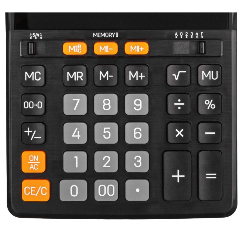 Настольный полноразмерный калькулятор Deli EM888 в черном корпусе популярен как среди бухгалтеров, так и среди продавцов, банковских и офисных сотрудников. Изготовлен из противоударного пластика и отличается большим дисплеем с увеличенными символами для комфортной работы. Позволяет корректировать введенное число, задавать настройки округления и количества знаков после запятой. Калькулятор имеет оптимальный набор вычислительных функций - основные математические операции, расчет процентов, извлечение квадратного корня, запоминание промежуточных результатов. Удобная клавиатура снабжена кнопкой ввода двойного нуля. Угол наклона дисплея не регулируется. Двойное питание (солнечная батарея + батарея) и автоматическое отключение через 5 - 12 минут бездействия увеличивают срок службы. Разрядность дисплея: 12. Размер: 202x159x31 мм. Батарейка LR54 в комплекте. Наличие кнопки "Коррекция последнего введенного значения" - да.