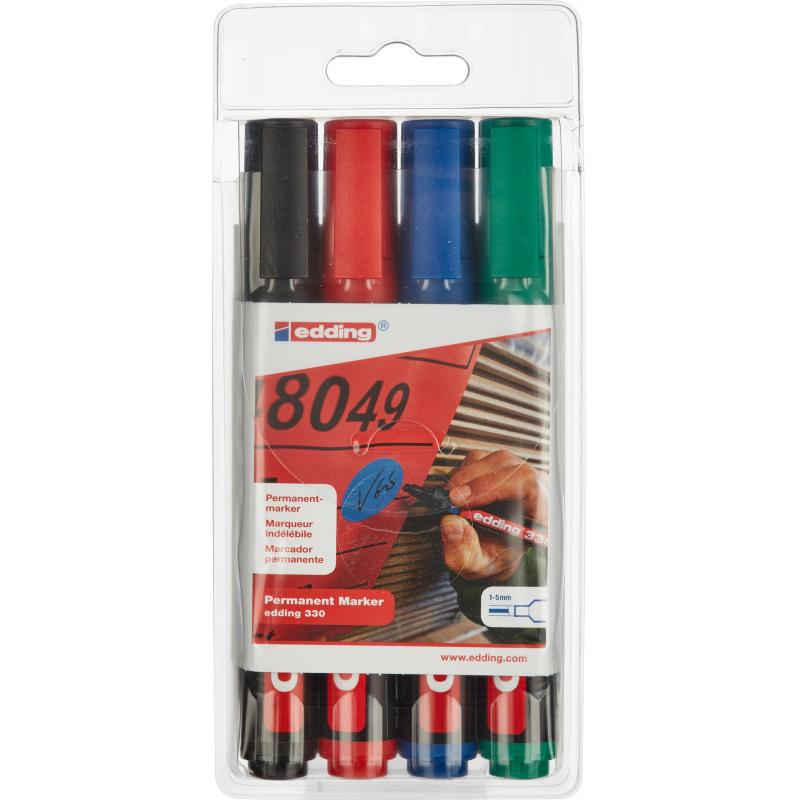 Набор перманентных маркеров Edding E-330 в прочном пластиком корпусе. Нестираемые светостойкие чернила на спиртовой основе. Идеально подходит для надписей на металле (в том числе и на грязном), картоне. Может использоваться для таких поверхностей, как дерево (в том числе влажное), стекло, пластик, керамика, кафель, различные пленки. Скошенный наконечник маркера позволяет провести линию толщиной от 1 до 5 мм. Страна производства - Германия. В наборе 4 цвета: синий, черный, зеленый, красный. Размеры маркера: диаметр 16 мм, длина 137 мм.